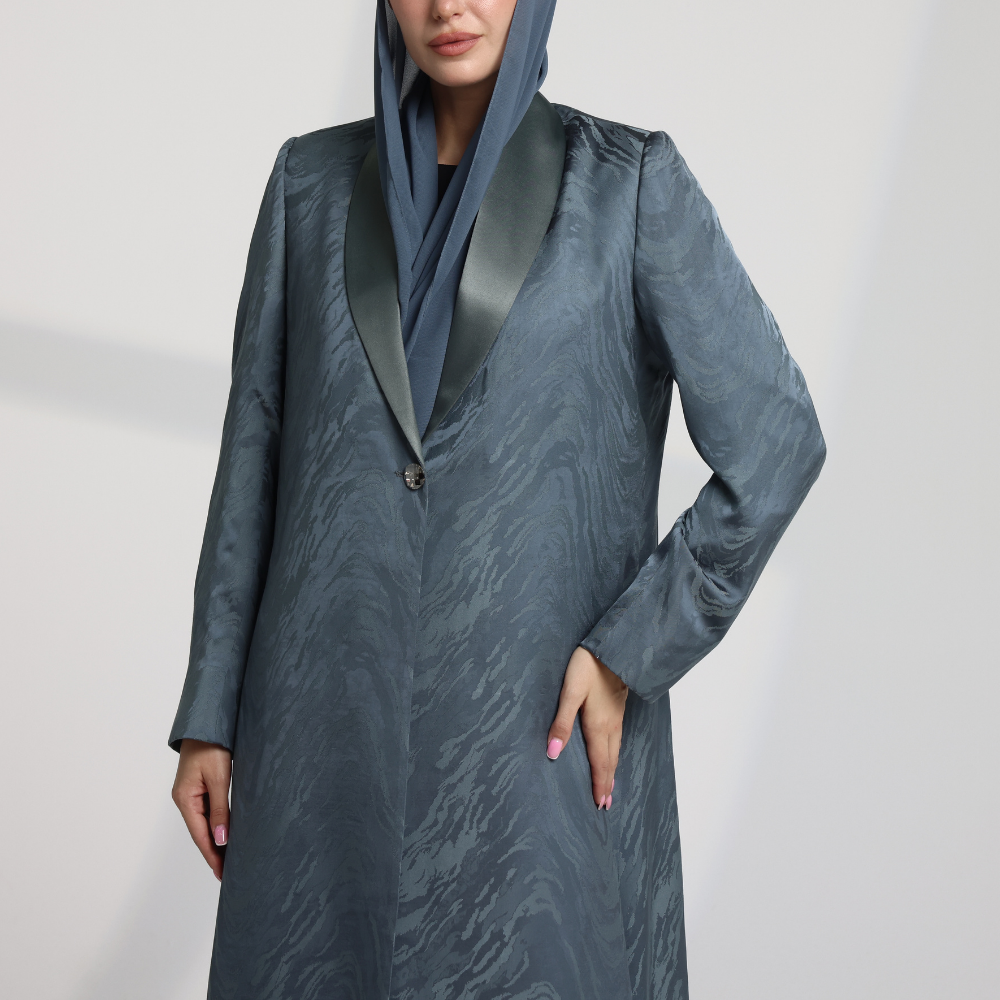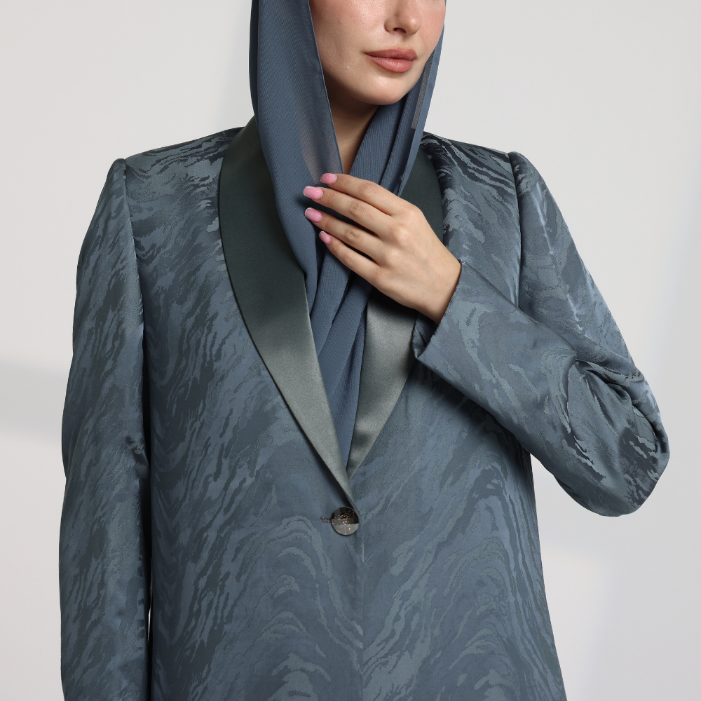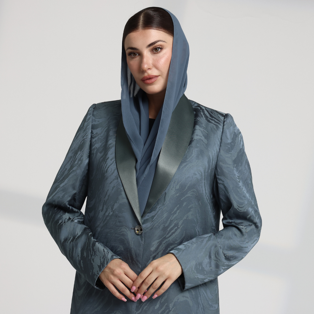 عباية أنيقة من Signature Line تجمع بين الفخامة والعملية، مصنوعة من قماش كريب جاكار ياباني فاخر، بتصميم بليزر عصري مميز، وياقة ساتان تضيف لمسة راقية، مع زر كريستال فاخر يمنح إطلالة متجددة تناسب المناسبات الرسمية واليومية.