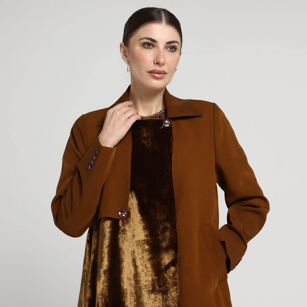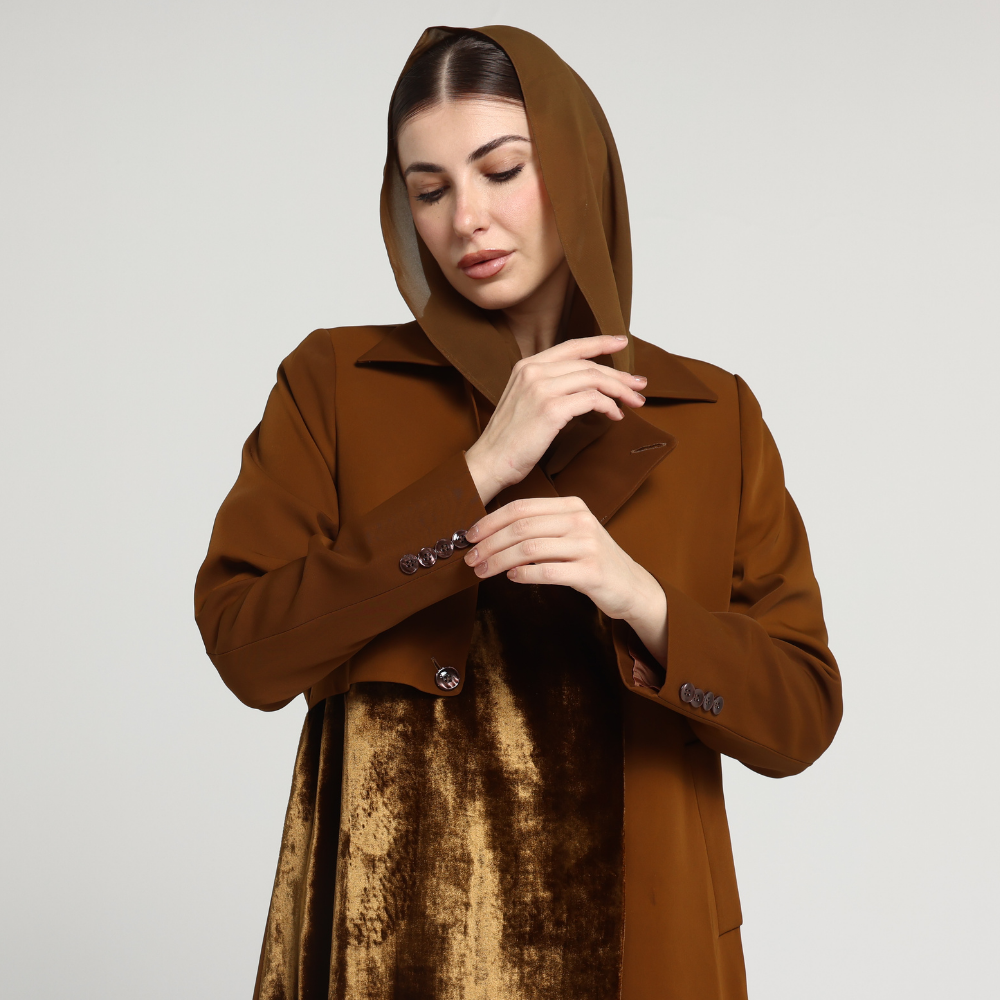 عباية أنيقة مستوحاة من قصة الترنش كوت الكلاسيكية بتصميم عصري يمكن ارتداؤه بعدة طرق.