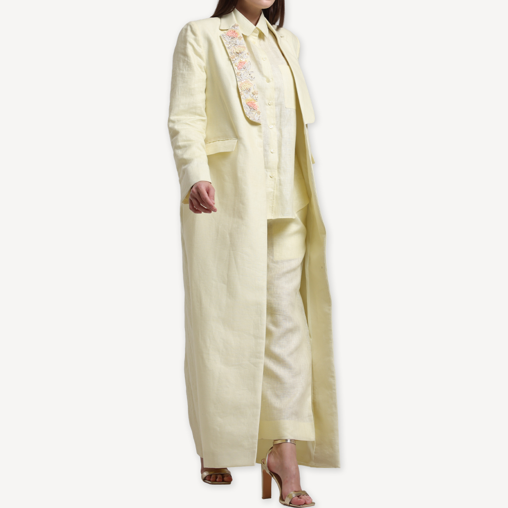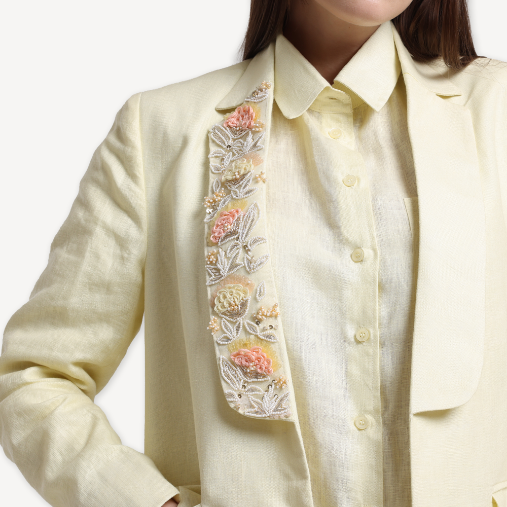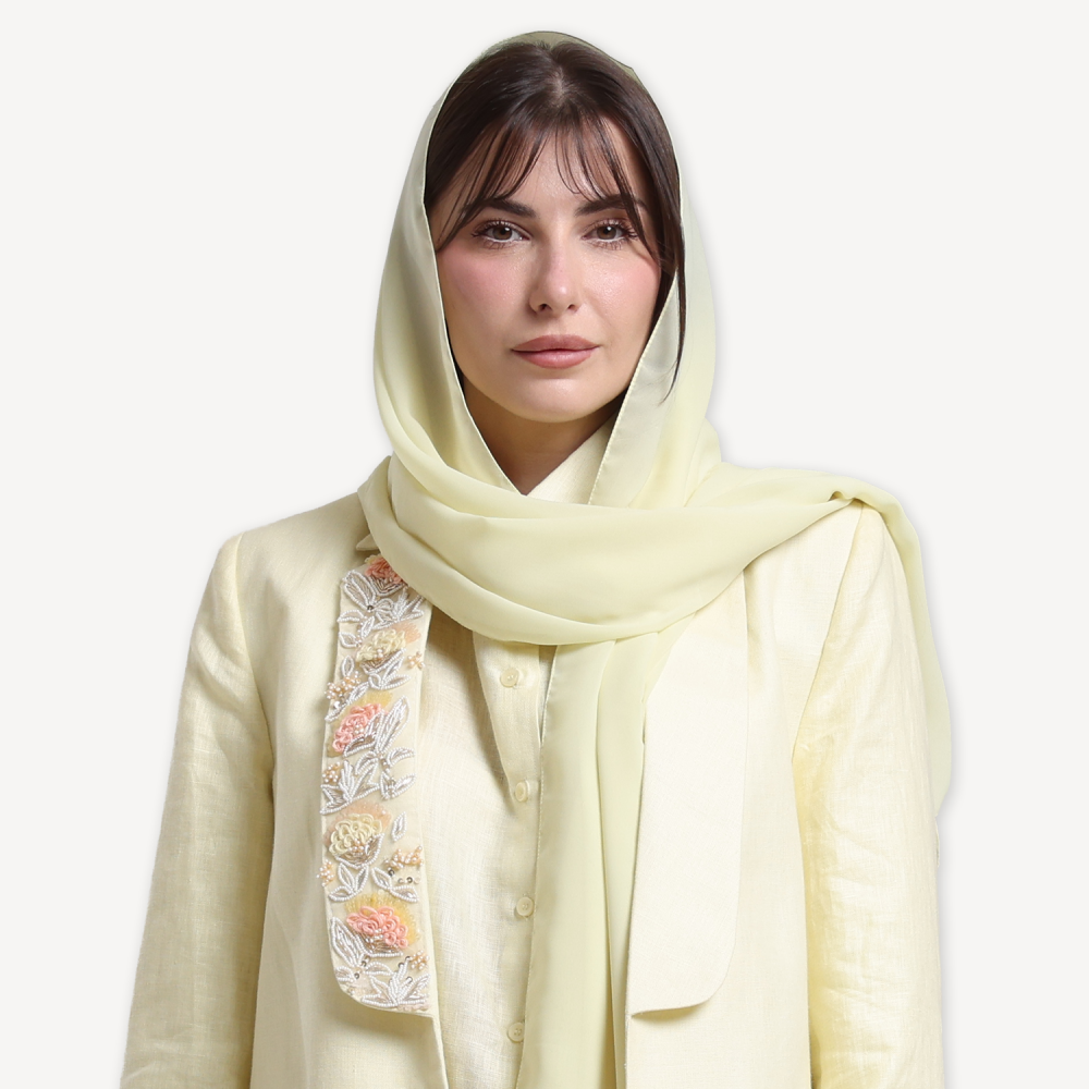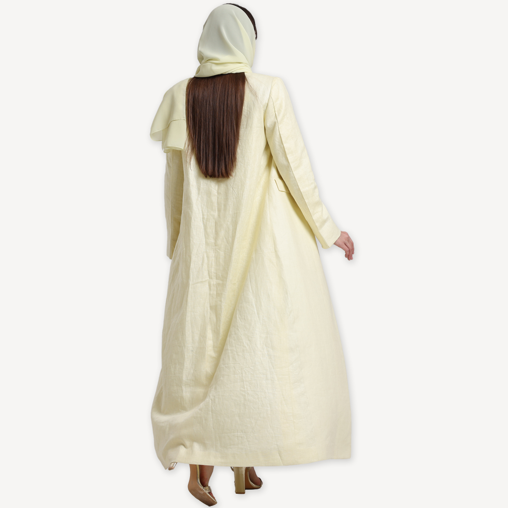 عباية بليزر بلون أصفر بتصميم بليزر أنيق يفيض بالنعومة و الأنوثة و يتميز بتطريز يدوي فاخر يزين الياقة بأزهار راقية وأوراق مطرزة بالخرز والترتر اللامع