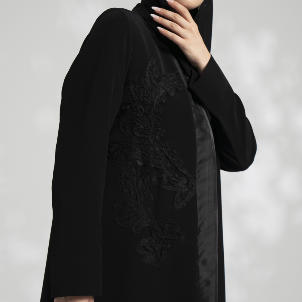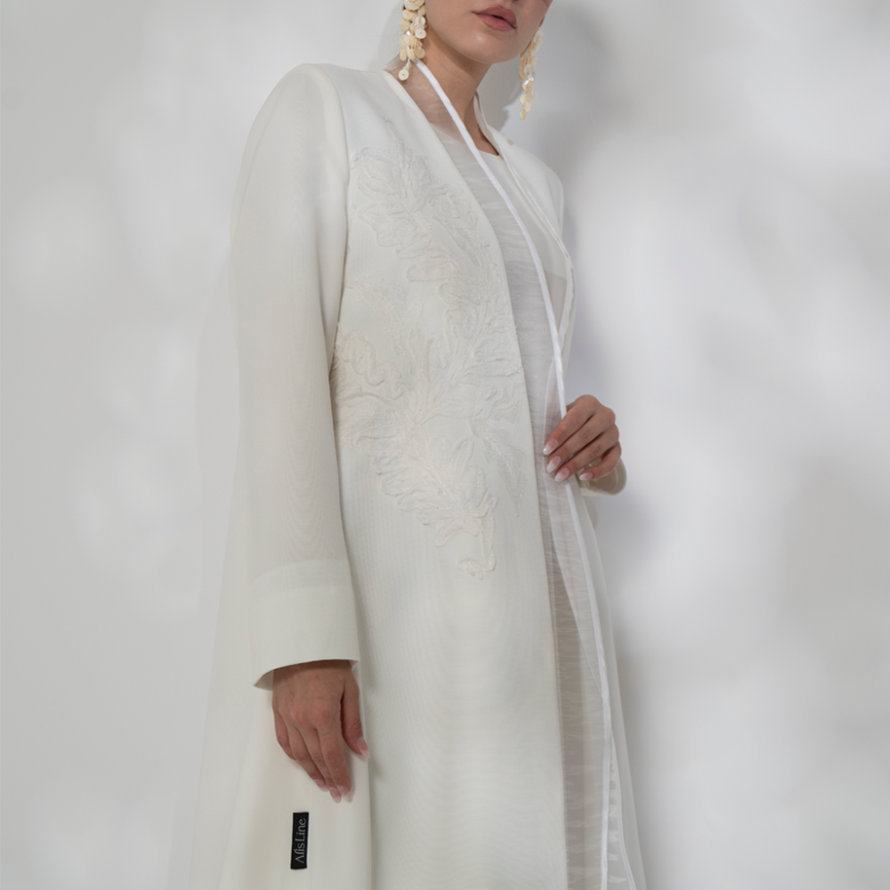 عباية من تصنيف Shaal Line ، تأتي بتصميم استثنائي يجمع بين البساطة والفخامة. تنسدل قصة الشال الأنيقة بخفة على الكتفين، وتكتمل بلمسة شفافة من قماش الأورجنزا الفاخر. ما يميزها هو التطريز النباتي الدقيق الذي يزين الجانب الأيمن من العباية، وكأنه نقش هادئ يُرسم على القماش بنعومة .