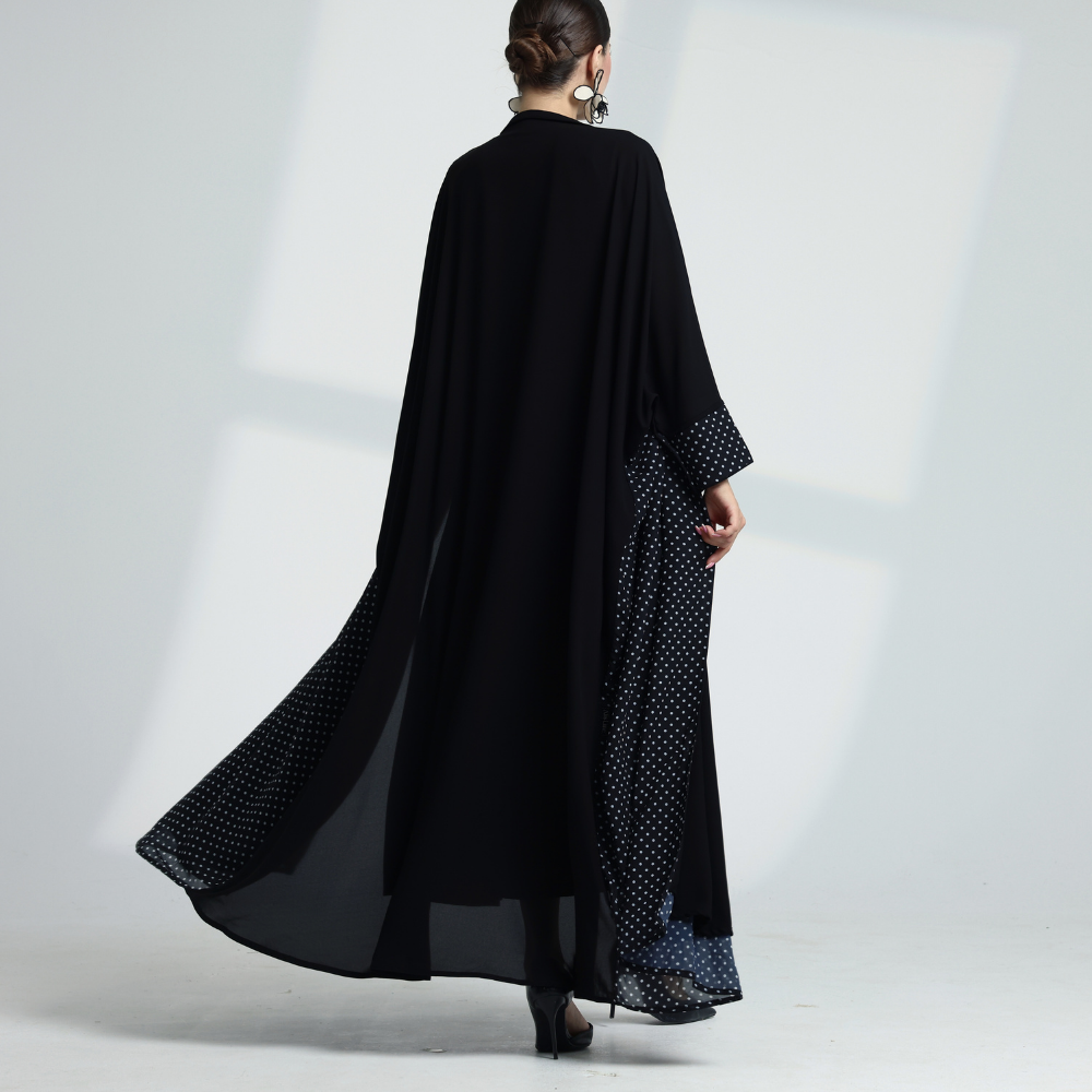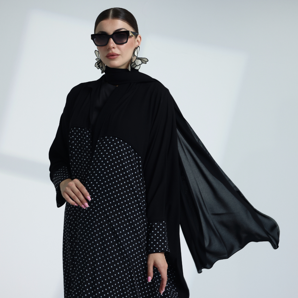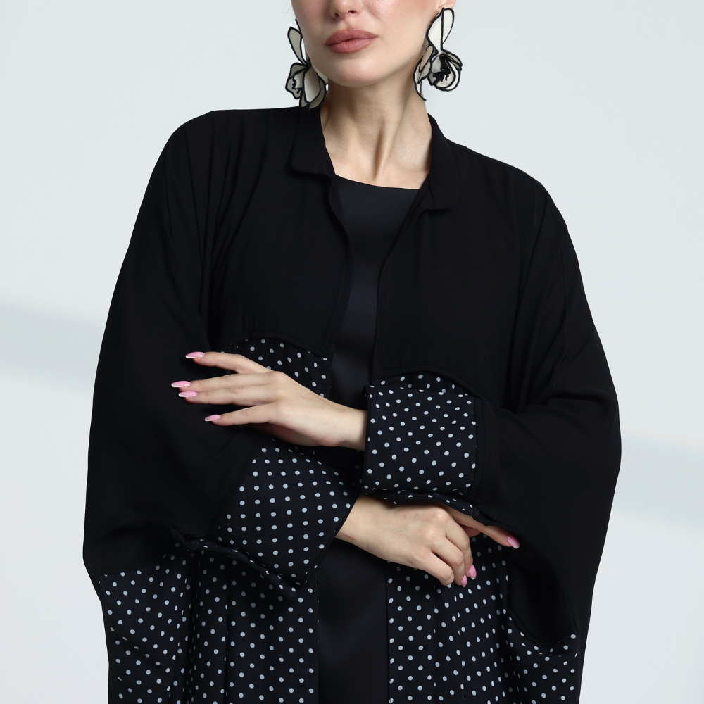 عباية بلمسة أنيقة من مجموعة Polka Dot، بتصميم بشت عصري يجمع بين البساطة والفخامة ، بطبعة منقطة مناسبة للمشاوير اليومية