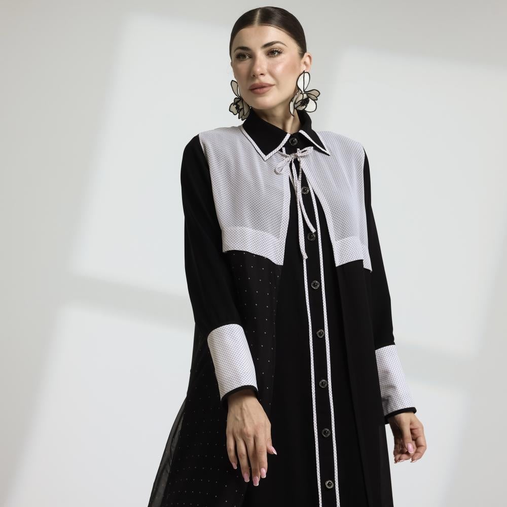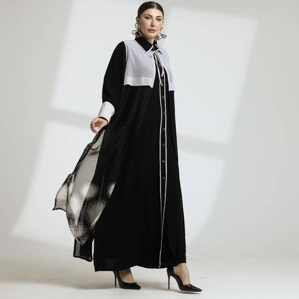 عباية بتصميم فاخر من قطعتين قميص أنيق و فست علوي يمنجها مظهراً عصرياً متجدداً ، صممت لتكون خياراً مناسباً لإطلالات مميزة في المناسبات و فصل الصيف .